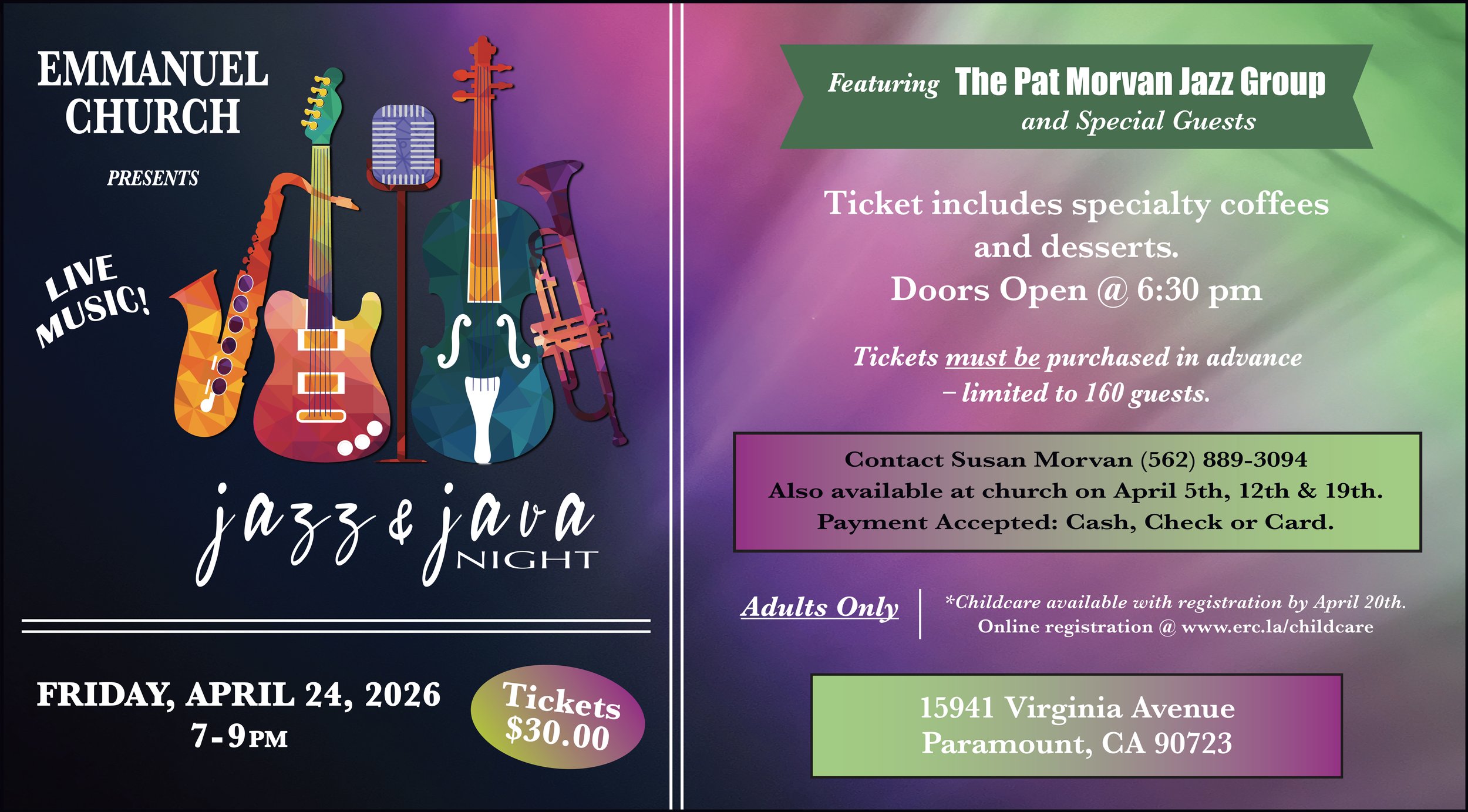 Join us for a relaxed night of music and community at Emmanuel. Whether you love jazz, enjoy a cozy café atmosphere, or just want a simple night out, Jazz & Java is a great place to come and unwind.